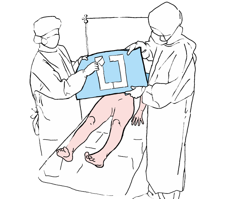 Den Schutzstreifen von dem unteren Haupt-Tuch entfernen. Das Tuch ankleben um die Grenze des OP-Feldes festzulegen. Danach an der Klebestelle das Tuch drücken, um die Haftung des Klebebandes auf der Haut des Patienten zu erhöhen.
