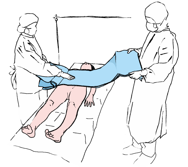Den unteren Teil des Tuches in Richtung des unteren Endes des OP-Tisches ausfalten und über die Beine des Patienten legen.