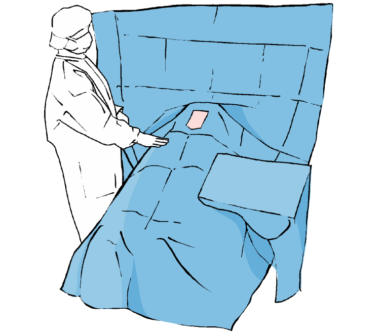 Bevor die Patientin zu abdecken (Abgrenzung des OP-Feldes), auf die Richtung achten, in der das Abdecktuch ausgefaltet werden soll, mithilfe der auf dem Tuch angebrachten Piktogrammen.