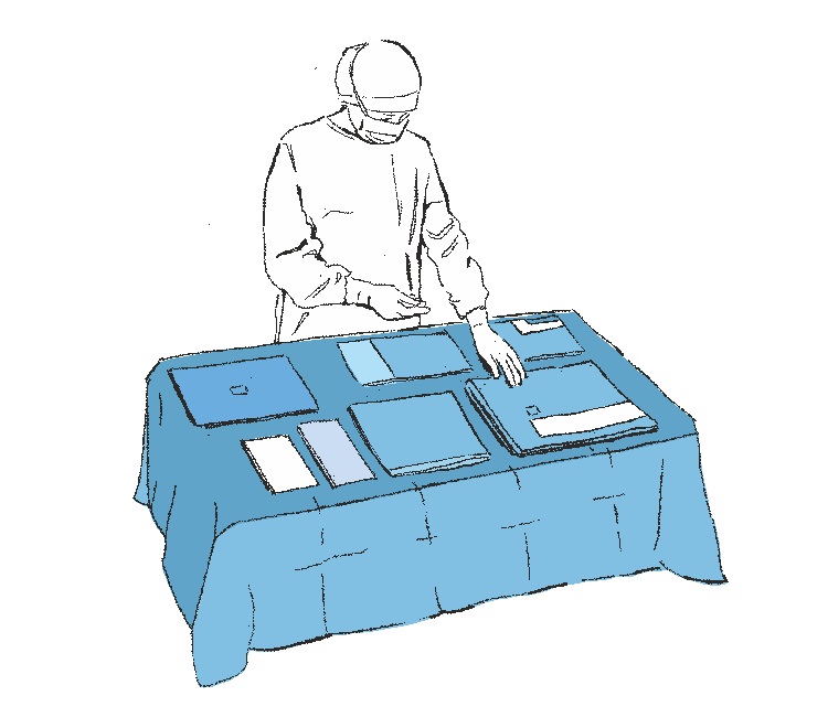 Die Außenverpackung bei Bewahrung der aseptischen Bedingungen öffnen und das Set auf den Instrumententisch herausnehmen. Das äußere Abdecktuch auf den Instrumententisch und darauf die jeweiligen Setelemente auslegen.