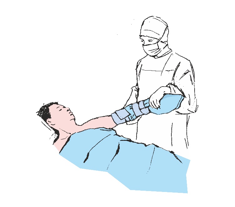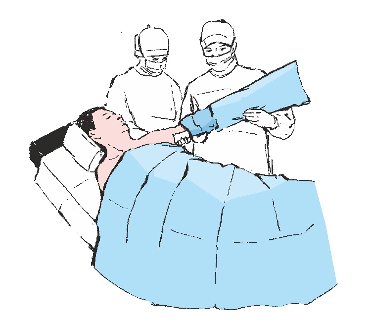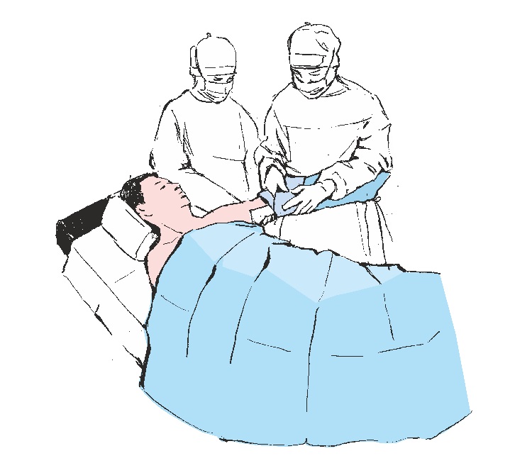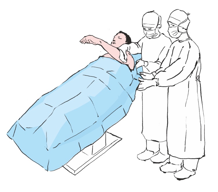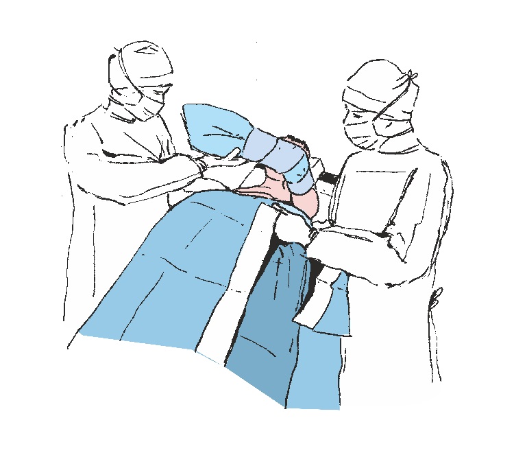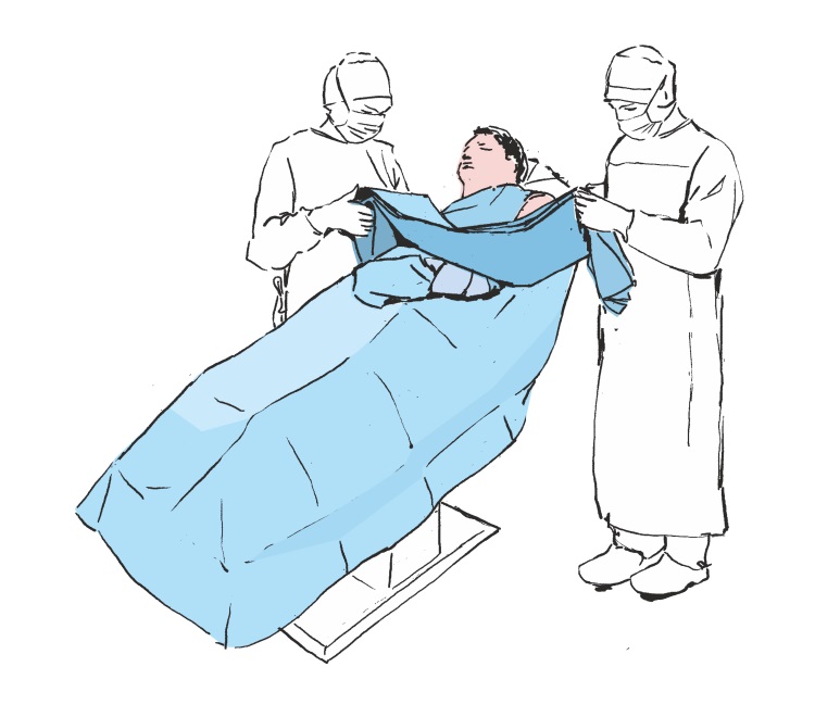 Entfernen Sie das verbleibende Schutzpapier und kleben Sie das Abdecktuch vorsichtig um die Schulter in Richtung des Kopfes des Patienten, wodurch die Seitengrenzen des Operationsfeldes begrenzt werden. Drücken Sie auf die Drapierungsadhäsionsstelle, um die Adhäsion des Klebebandes an der Haut des Patienten zu erhöhen.
