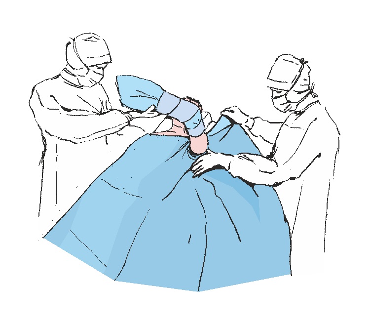 Bevor Sie mit der Sicherung der Patientin beginnen (Bestimmung des Operationsfeldes), achten Sie auf die Richtung, in der das Abdecktuch aufgeklappt wird, mithilfe der auf dem Tuch befindlichen Piktogramme.
