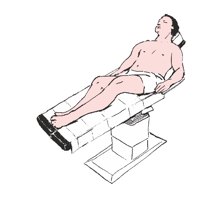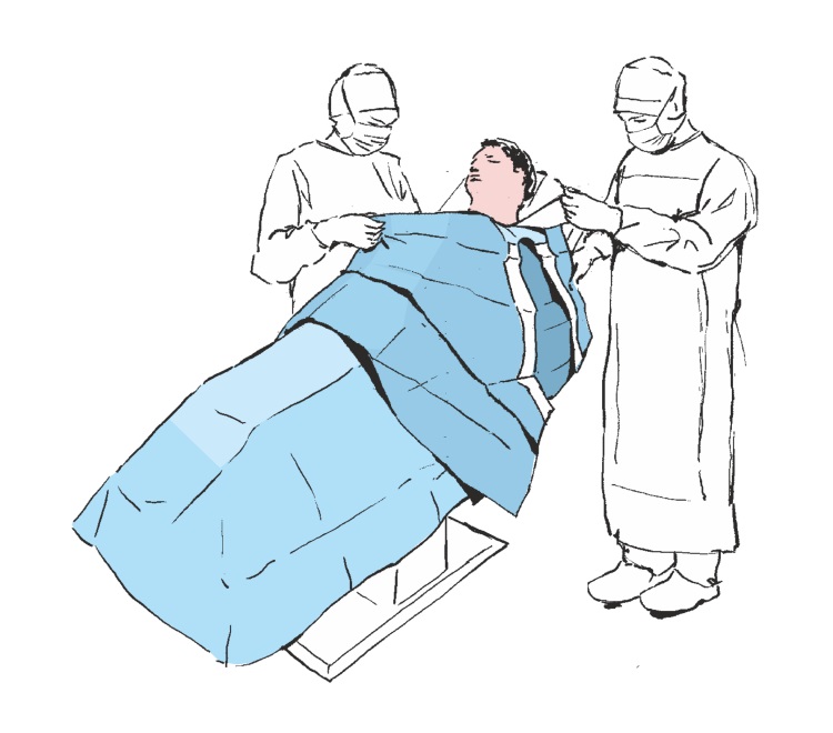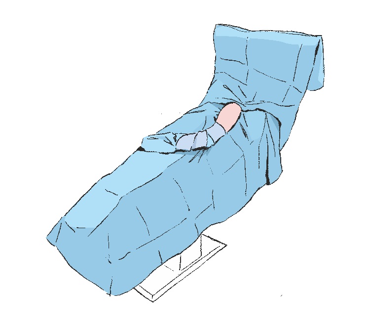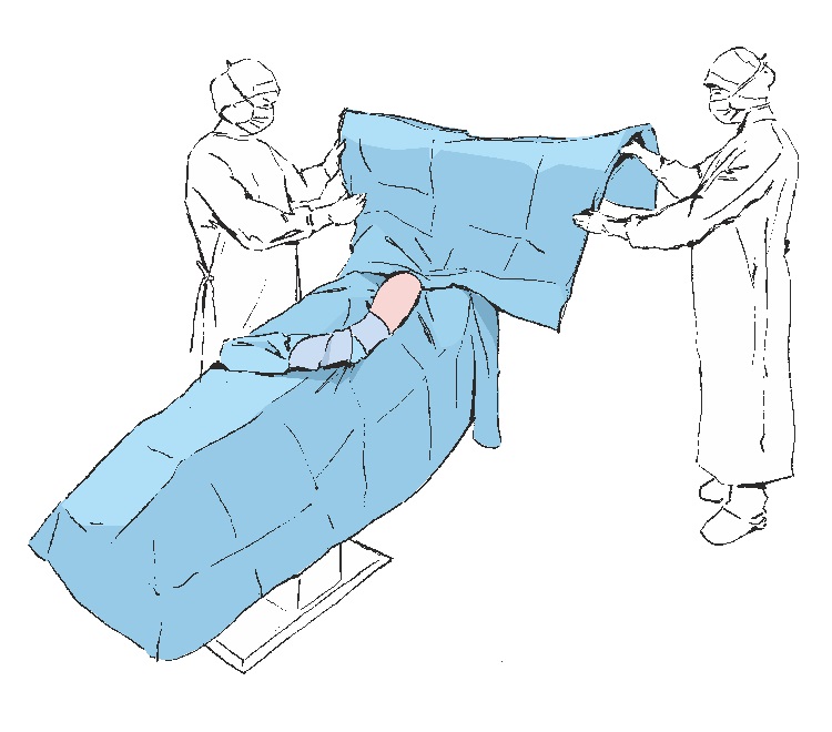 Falten Sie den unteren Teil des Abdecktuchs in Richtung der Unterkante des Operationstisches aus und decken Sie so die unteren Gliedmaßen des Patienten.