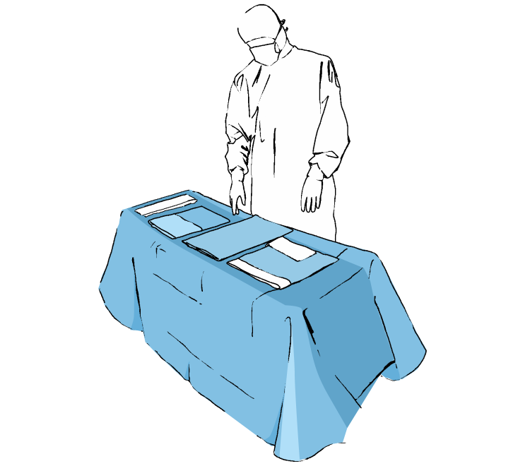 Die Umverpackung unter Beachtung der Grundsätze der Asepsis öffnen und das Set auf den Instrumententisch legen. Das äußere Tuch auf dem Instrumententisch und die einzelnen Elemente des Sets darauf ausbreiten.