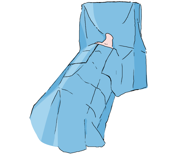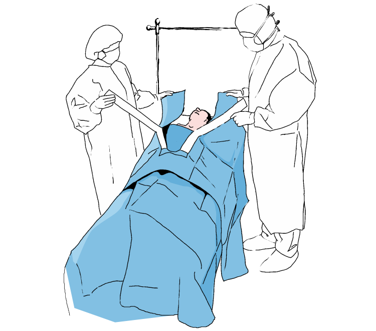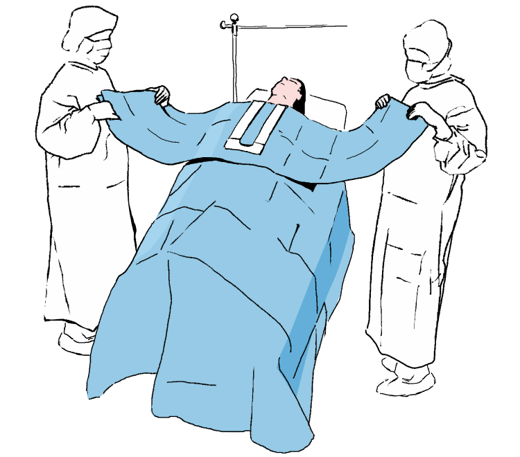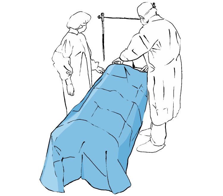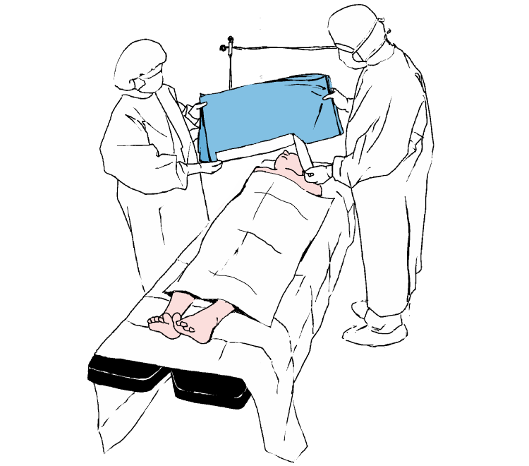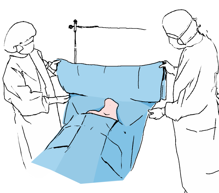 Den unteren Teil des Tuches in Richtung des unteren Endes des OP-Tisches ausfalten und über die Beine des Patienten legen.