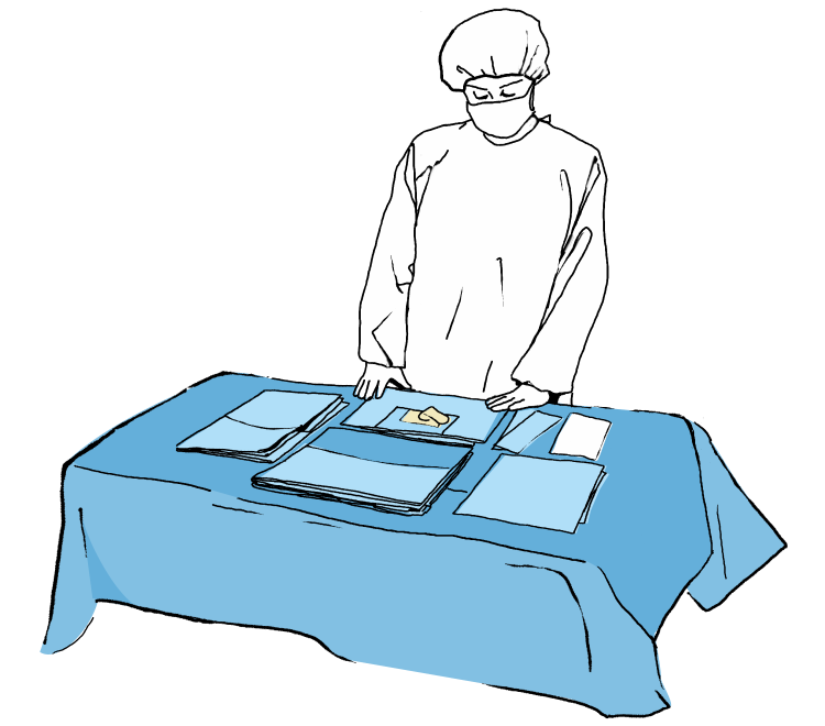 Die Umverpackung unter Beachtung der Grundsätze der Asepsis öffnen und das Set auf den Instrumententisch legen. Das äußere Tuch auf dem Instrumententisch und die einzelnen Elemente des Sets darauf ausbreiten.