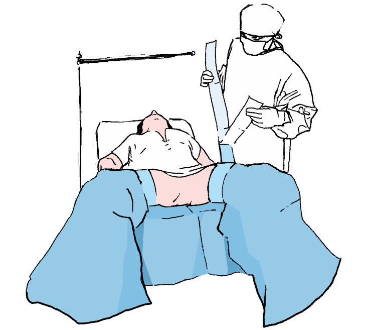 Die Seiten des Tuches ausfalten so, dass sie frei vom OP-Tisch hängen, und den oberen Teil des Tuches in Richtung der Anästhesieposition ausfalten. Das Abdecktuch über den Schirm führen und so einen Anästhesieschirm erzeugen. Den unteren Teil des Tuches in Richtung des unteren Endes des OP-Tisches, teilweise zwischen den Beinen des Patienten, ausfalten.