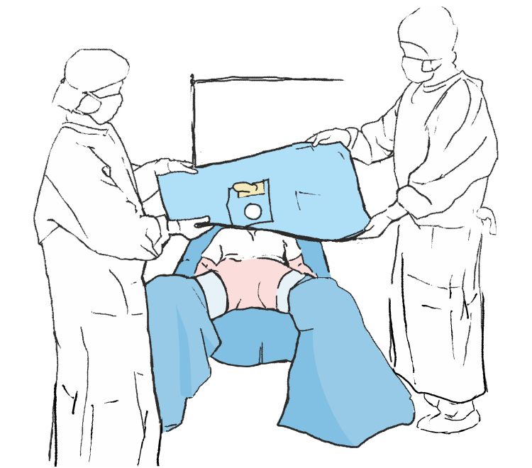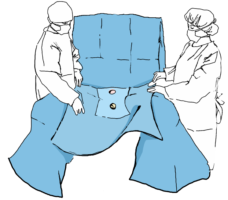 Das Haupttuch zum Patienten hin teilweise ausfalten, die Löcher an den entsprechenden Stellen des OP-Feldes anpassen und das Tuch auf den Patienten legen, um so das OP-Feld zu bestimmen.